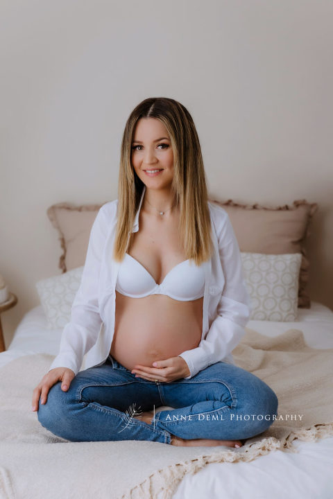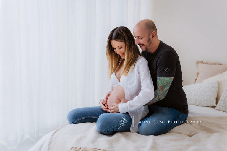Neben meinen Fine Art Babybauchshootings mache ich natürlich auch sehr natürliche Babybauchfotos. Vroni und Daniel wünschten sich sehr cleane, unverspielte Bilder. Ich mag diese Art von Shootings ebenso gerne. Ohne viel Posing und oft auch aus einer innigen Situation des Paares heraus, mache ich diese Fotos. Vroni und Daniel mussten auch gar nicht viel machen um auf den Fotos zu wirken. Die Harmonie des Paares sprang mir direkt in die Kamera 🙂 Natürlich führe ich euch durch das Shooting, ihr müsst also keine Angst haben, dass ihr unbeholfen vor der Kamera steht. Aber ich reagiere eben auch ganz schnell auf spontane Situationen. Dadurch entstehen die natürlichen Babybauchbilder.