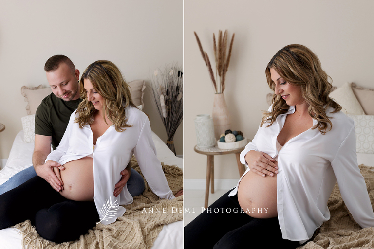 Schon letztes Jahr haben mich Alex und Markus für ein Babybauchshooting in meinem Studio besucht. Ich kann mich noch gut erinnern, es war einer dieser schwühlheißen Tage und wir haben alle fürchterlich geschwitzt 🙂 . Für Alex war es besonders hart, da es den Frauen während der Schwangerschaft sowieso immer zu warm ist. Alex hatte aber ein super Make-up und Styling, so dasss sie trotz heißer Temperaturen auf den Babybauchfotos wunderschön aussah. Ich finde es immer ganz toll, wenn sich meine werdenden Mütter fürs Shooting richtig rausputzen, denn es ist schließlich ein ganz besonderer Moment, den man da für ewig festhält. Wenn ihr für ein Make-up und Styling jemanden braucht, dann kann ich euch Gabriele Lohse empfehlen. Sie macht professionelle auf die Babybauchshootings abgestimmte Make-ups.